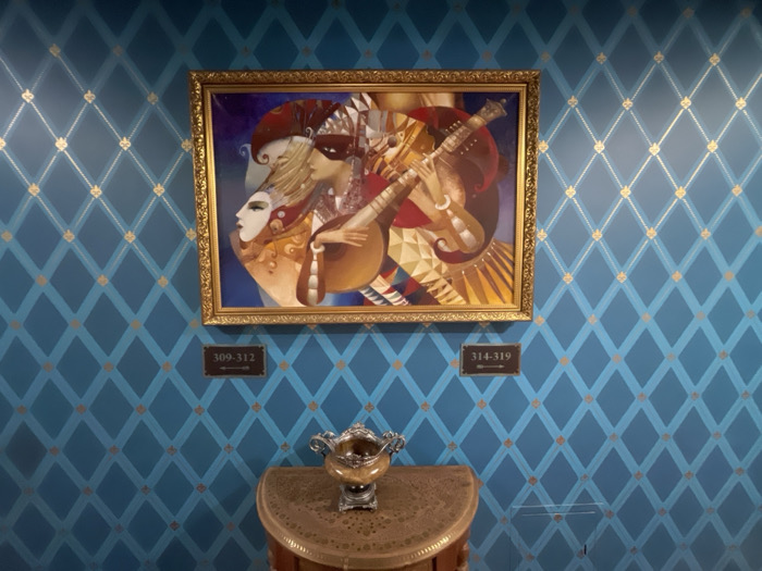 A framed painting hangs on a patterned blue wall. The artwork depicts a musician and people wearing masks. Below the painting are signs indicating room numbers: "309-312" on the left and "314-319" on the right, each with an arrow pointing to the respective rooms. A small, ornate table with a decorative vase sits below the signs. The wall is adorned with a diamond pattern and golden accents.