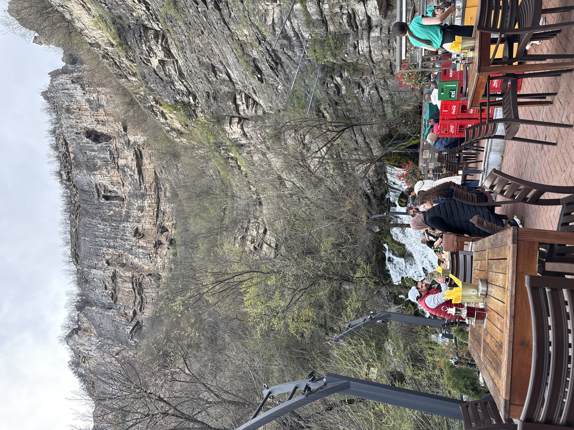 The scene depicts a restaurant in Milanovo, Bulgaria, nestled near a cliffside waterfall. Numerous patrons occupy wooden tables and chairs. A server dressed in a green shirt is visible behind stacked Coca-Cola and Heineken crates, likely serving customers. People are dining, engaging in conversation, and enjoying the view of the waterfall. The natural environment is characterized by a high, rugged cliff face, bare trees with budding leaves, and the cascading waterfall. A black metal structure is visible in the foreground, possibly part of the restaurant's infrastructure. The atmosphere seems relaxed and scenic, with patrons enjoying the natural beauty while dining.