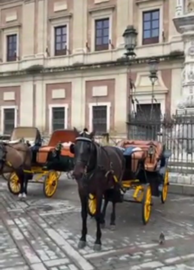 square in an old European city. A woman in a green coat stands by several horse-drawn carriages, all painted yellow and brown or white. The carriages are parked on a cobblestone street, in front of a large building with many windows. People are walking around the square, and there are other buildings in the background, including a tower. The sky is overcast.