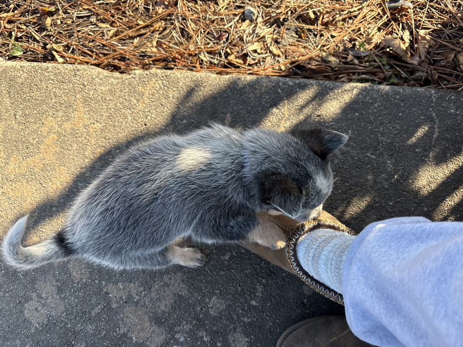 - "This overhead photograph, taken in Ball Ground, United States, captures a young Australian Cattle Dog puppy interacting with a human's foot outdoors" by FM-jc1Mt1, licensed under CC BY 4.0