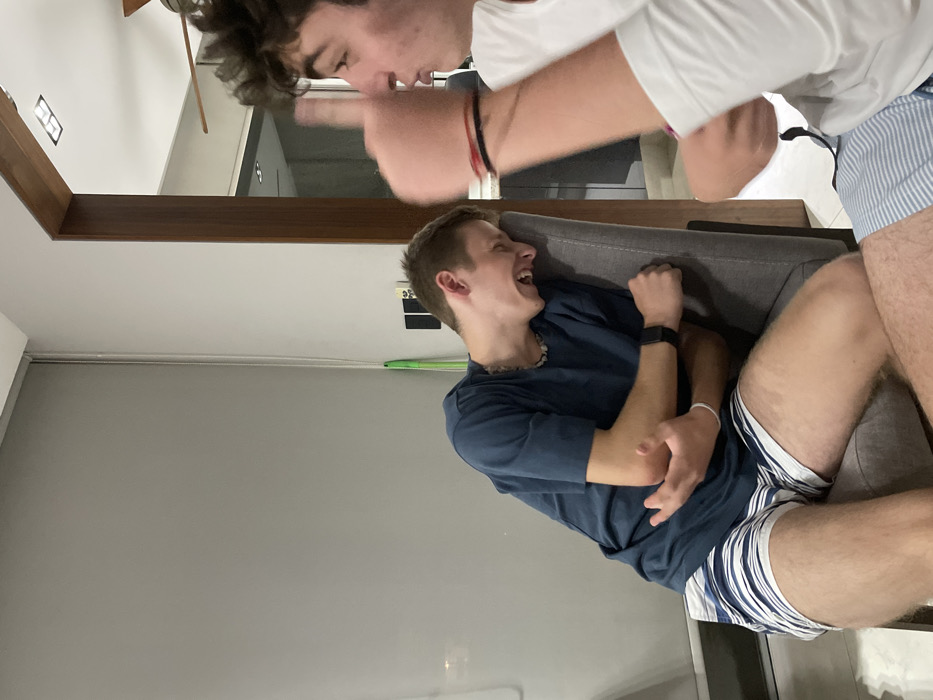 Two young men are engaged in playful interaction indoors. One man is lying on a gray couch, laughing with his eyes closed, wearing a navy blue t-shirt and striped shorts. Above him, another man stands, pointing toward him with a playful expression. He is wearing a white t-shirt and matching striped shorts. The room has light gray walls and a dark brown frame around the doorway. The image is rotated to the side.