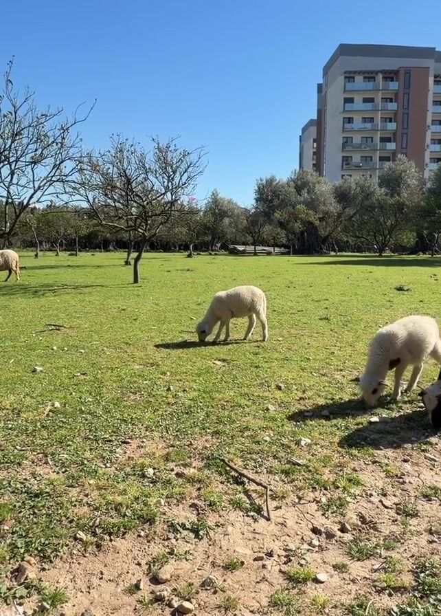 The scene is a sunny outdoor view of a grassy field with several sheep grazing. The sky is clear and blue. In the background, a modern, multi-story building is visible. Several trees are sparsely scattered throughout the field, casting shadows. In the foreground, three sheep are closer to the camera; two are white and one is dark brown. All the sheep are grazing on the grass. A patch of dry, bare ground is visible in the lower part of the frame.
