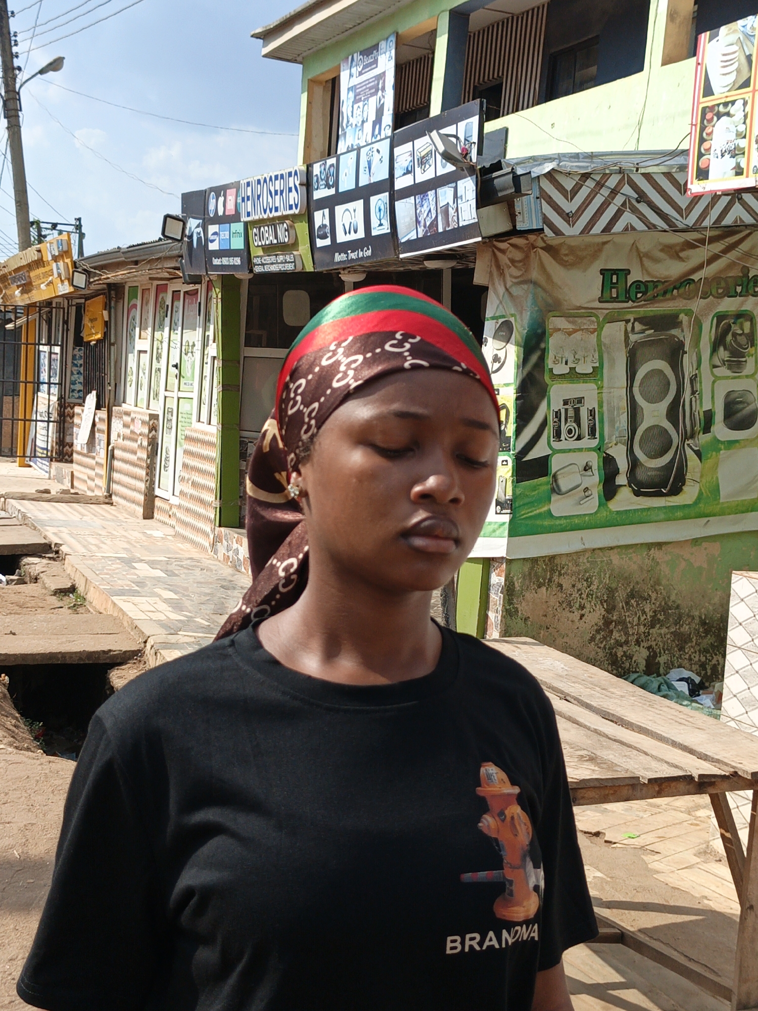 An image captured in Unknown, Chad, depicts a young female standing in the foreground of a commercial street. She is positioned slightly off-center to the left, facing generally forward with her eyes closed or cast downward. She wears a black short-sleeved t-shirt with an orange fire hydrant graphic and the partial word "BRANDNA" visible on the chest. A headscarf, brown with repeating 'G' logos and green and red stripes, covers her hair. A light-colored stud earring is present in her right earlobe. The background features a row of single and two-story commercial buildings under a bright sky. The nearest building displays a prominent sign reading "HENROSERIES GLOBAL NIG" with various electronics brand logos and a contact number, indicating sales of phones and general merchandise. Below this, a green banner also advertises "Henroseries" with images of electronic devices such as speakers and a camera. The building facade includes a brown and white chevron pattern. To the right, a simple wooden table with a light-colored top is visible. The ground in the immediate foreground consists of dirt or unpaved earth, transitioning to a paved or tiled sidewalk leading past the shops. An open drainage ditch or culvert separates the immediate foreground from the sidewalk. A utility pole with an overhead street light fixture is present on the far left, with power lines traversing the upper portion of the frame. The scene conveys an outdoor, urban commercial environment with visible infrastructure and signage.