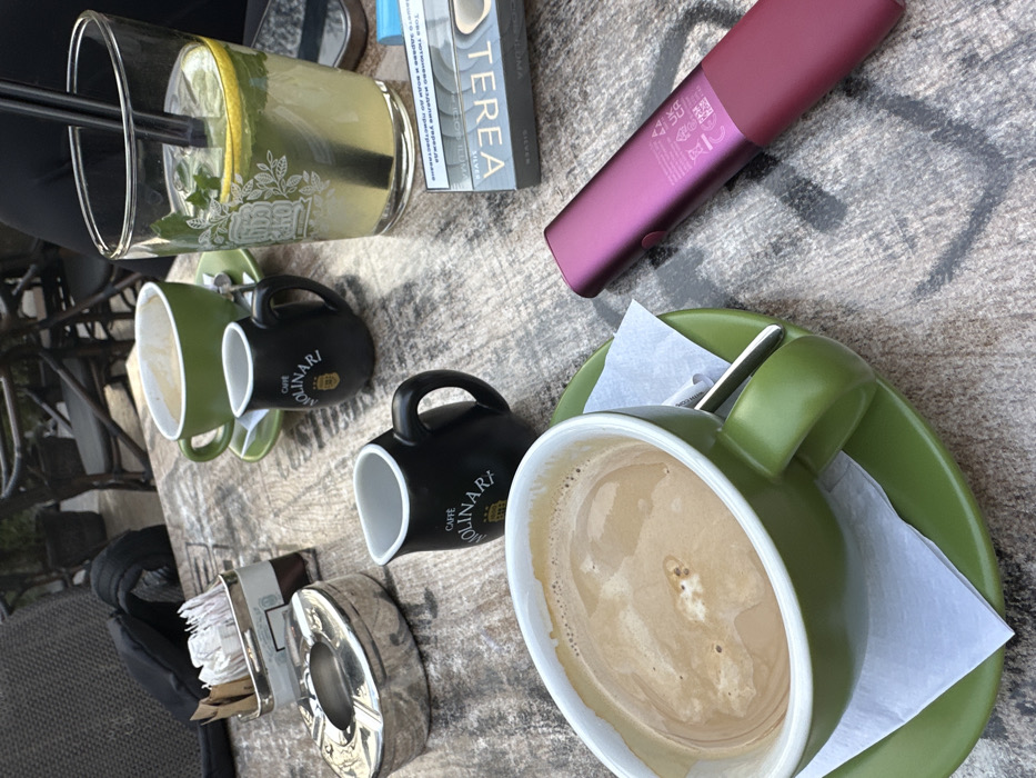 An outdoor cafe table in Sofia, Bulgaria, is depicted in a close-up, high-angle view. The table surface is distressed wood-grain laminate. In the immediate foreground, a lime green ceramic cup filled with a light brown, frothy coffee sits on a matching saucer, with a white folded napkin positioned between the two and a silver spoon resting within the cup. To its right, a small black ceramic pitcher branded "CAFFE MOLINARI" in white text and a yellow crest is visible. Further back, from left to right, are a silver-colored circular metal ashtray and a rectangular metal dispenser containing individually wrapped sugar packets. Another identical "CAFFE MOLINARI" pitcher is positioned next to the sugar dispenser. To its right, an empty lime green ceramic coffee cup rests on its saucer, showing residual coffee stains. Adjacent to it, a clear glass contains a light yellow beverage with ice cubes, mint leaves, and lemon slices, through which a black plastic straw protrudes. A light blue-grey box of "TEREA SILVER" heated tobacco sticks, displaying Cyrillic health warnings ("НЕ Е БЕЗВРЕДНО. ПРЕДИЗВИКВА ЗАВИСИМОСТ"), lies next to the glass. A magenta-colored electronic heated tobacco device, likely an IQOS, with regulatory markings on its surface, is positioned to the right of the tobacco stick box. The background is out of focus, revealing dark wicker chairs and tabletops typical of an outdoor cafe setting. A portion of a person's lap and arm, clad in dark fabric, is visible in the upper right quadrant of the image, suggesting at least one individual is seated at the table.