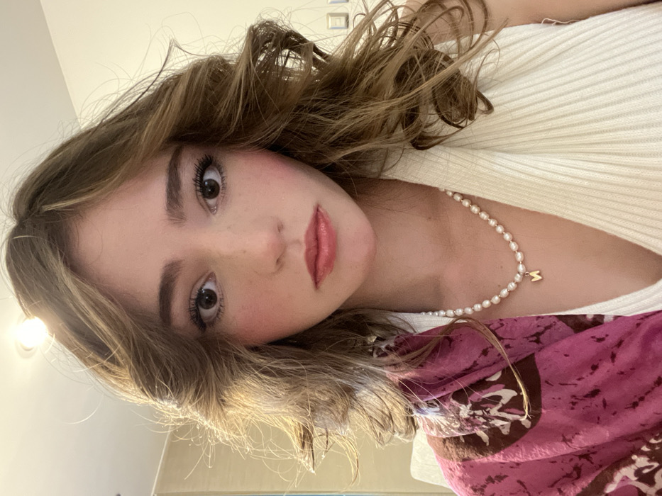A young woman with light brown wavy hair is facing the camera, her face slightly tilted. She has fair skin, light blush on her cheeks, and natural lip color. She wears a white, ribbed top and a pearl necklace with a gold "M" pendant. A magenta and brown scarf or fabric drapes over her shoulder on the right side of the frame. A light source is visible in the upper left corner.