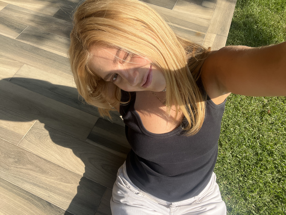 A selfie of a woman with blonde hair, wearing a black tank top and white pants. She's seated on a surface that transitions from wood-like planks to grass. Bright sunlight casts shadows on the planks and her face. She is looking down at the camera with a slight smile. A necklace is visible around her neck.