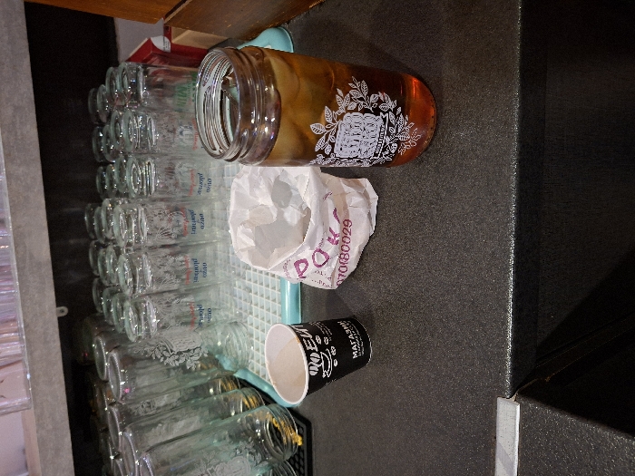 The image displays a close-up, slightly downward-angled view of a service counter, located in Velingrad, Bulgaria. The dark, speckled countertop supports a black disposable paper cup with white Cyrillic text, including "МАГАЗИНИ", on the left. Adjacent to it, a crumpled white paper bag with partially visible purple text and numbers "070(80029" rests. To the right, a tall, clear glass jar, without a lid, holds a reddish-brown liquid with multiple ice cubes. This jar features a distinct white decorative pattern of leaves and flowers, encompassing the text "GRAND MAMA'S". In the background, on a light blue-green grid-patterned drying rack, approximately two dozen clear drinking glasses are arranged, some inverted, others upright. Several glasses display white etched or printed designs, including floral patterns and text such as "plonjan" and "MILK". Above these glasses, a grey shelf is visible, holding additional translucent glassware. A partial red carton is discernible behind the glasses on the right side of the drying rack, and a brown wooden surface borders the scene on the far right. No individuals are present in the scene.
