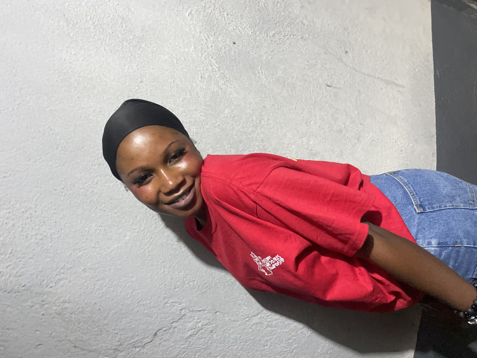 A young woman in a black head covering poses with a smile, facing slightly left of the viewer. She wears a bright red T-shirt and light blue denim jeans. The background consists of a textured white wall and a dark area to the right, suggesting a corner. The photograph appears to be taken indoors with a slightly tilted angle. Her makeup includes noticeable blush and lip color.