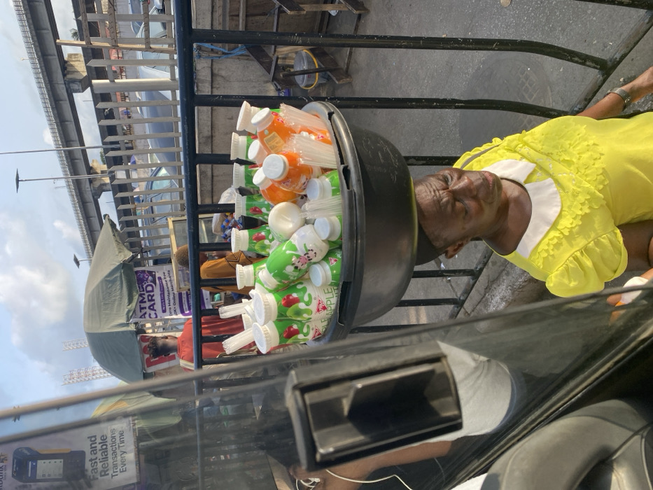 An elderly woman in a bright yellow dress balances a large black bowl filled with juice bottles on her head. The bottles are predominantly green apple juice and orange juice. She stands on a paved street near a black metal railing. Behind her, a vendor operates under an umbrella advertising "ATM CARD" services. Part of a car's interior is visible in the foreground, suggesting the photo was taken from inside a vehicle.