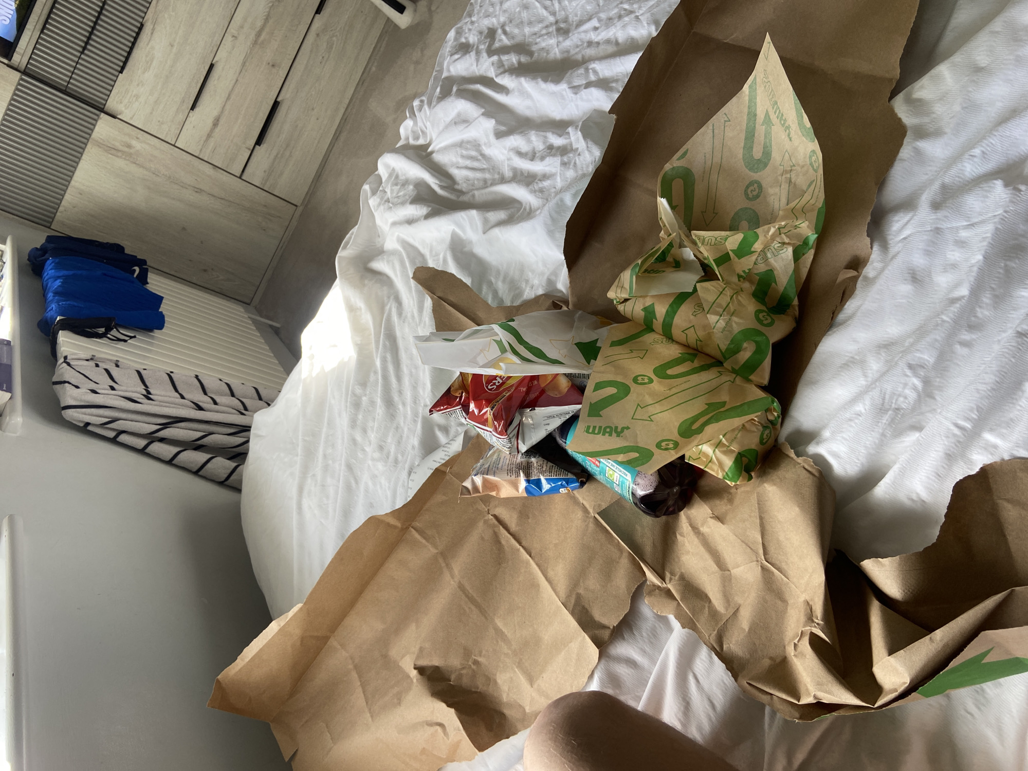 The scene depicts a bed covered with white sheets. A brown paper bag, torn open, lies on the bed, containing empty Subway sandwich wrappers, a bag of chips, and a bottle of soda. A knee of a person is visible in the foreground. Adjacent to the bed is a stack of folded clothes and a wardrobe. The image does not provide any information that allows the location to be determined within Welwyn Hatfield, United Kingdom.