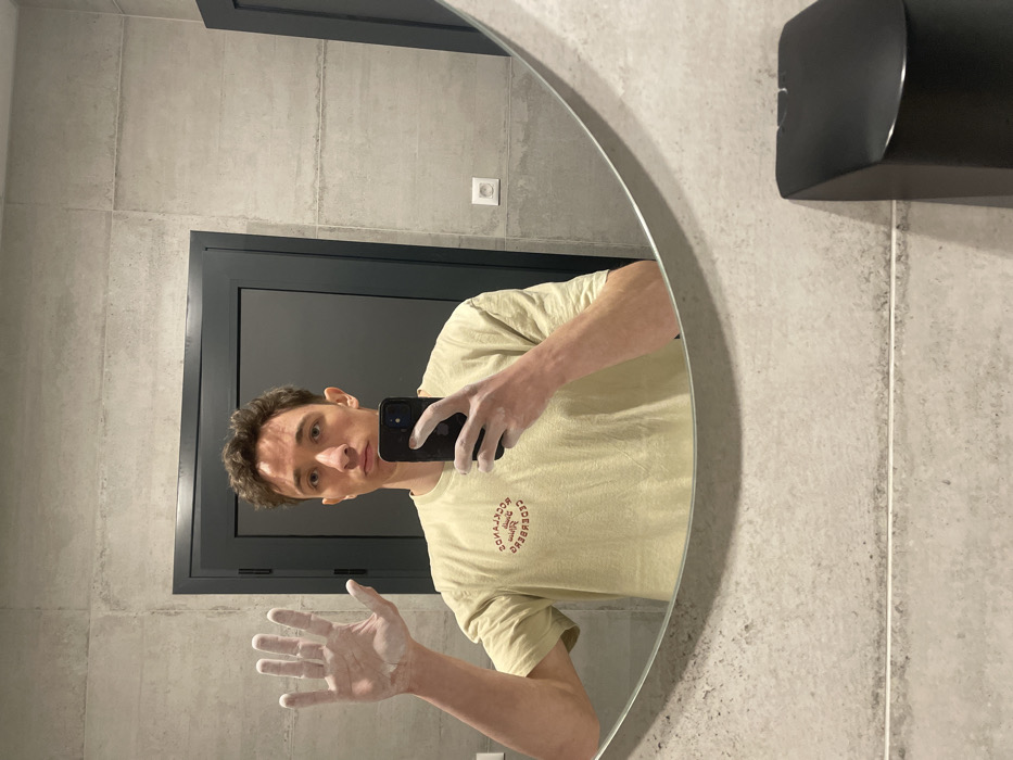 The image depicts a male individual, appearing to be in his twenties, captured in a mirror selfie within a public restroom or changing facility. He has short, wavy brown hair and is wearing a light tan t-shirt with red lettering, part of which reads "ROCKLANDS" and "CEDERBERG." He holds a black smartphone in his right hand, taking the photograph, and his left hand is raised, palm facing forward. Both hands are visibly coated in a white powdery substance, consistent with climbing chalk. The background, reflected in the large, frameless oval mirror, consists of light gray tiled walls. A dark gray door with a matching frame is prominent behind the subject's reflection, and a white electrical outlet is mounted on the wall to the right of the door. Below the mirror, an unreflected section of the tiled wall is visible, along with a black, wall-mounted dispenser for soap or sanitizer in the bottom right corner. Given the chalked hands and the "ROCKLANDS" and "CEDERBERG" branding on his shirt, the location is inferred to be a climbing gym, specifically within a restroom or changing area of a climbing gym in Sofia, Bulgaria, such as the Rockland Climbing Center.