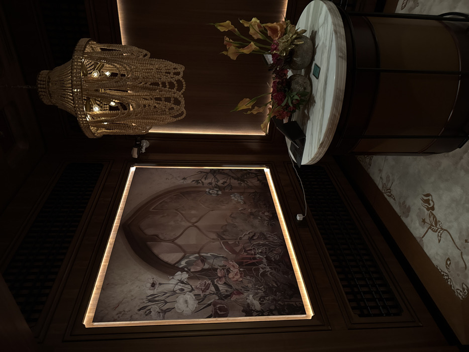 An illuminated artwork depicting flowers under a window is framed by dark wood. Above it hangs an ornate chandelier. To the right, a round table with a marble top supports a vase arrangement with flowers and leaves, alongside a small black electronic device. The walls are dark wood and neutral patterned wallpaper. Overall lighting is dim, accentuating the art and lighting elements.