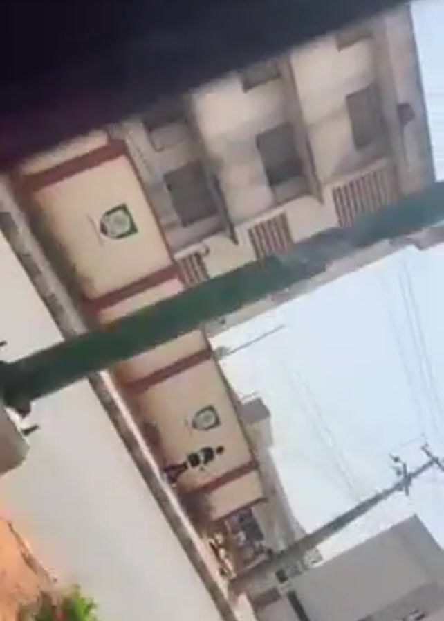street scene in front of a multi-story building. People are walking on the sidewalk. A black car is parked on the street. Several motorcycles are riding down the street. The video appears to be taken from a moving vehicle. Power lines are visible above.