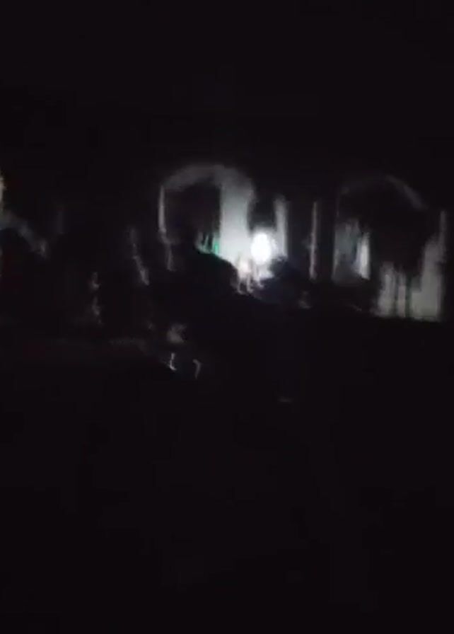 dark night scene with a building lit up with lights and several figures visible. There is a vehicle, possibly a motorcycle, in the foreground. The scene seems chaotic with possible activity around the building.