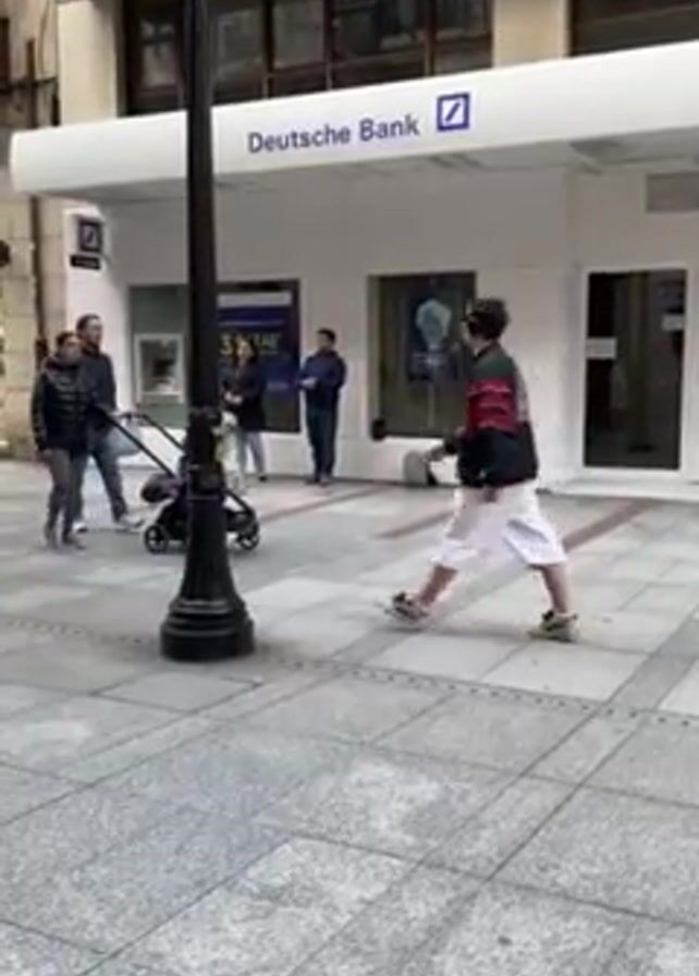 street scene in front of a Deutsche Bank branch. The bank building is white with the Deutsche Bank logo prominently displayed. Several people are walking on the sidewalk. One person is pushing a baby stroller. A man with headphones is walking past. There is a black lamppost in the foreground. The sidewalk is paved with gray rectangular stones. Other businesses are visible in the background.