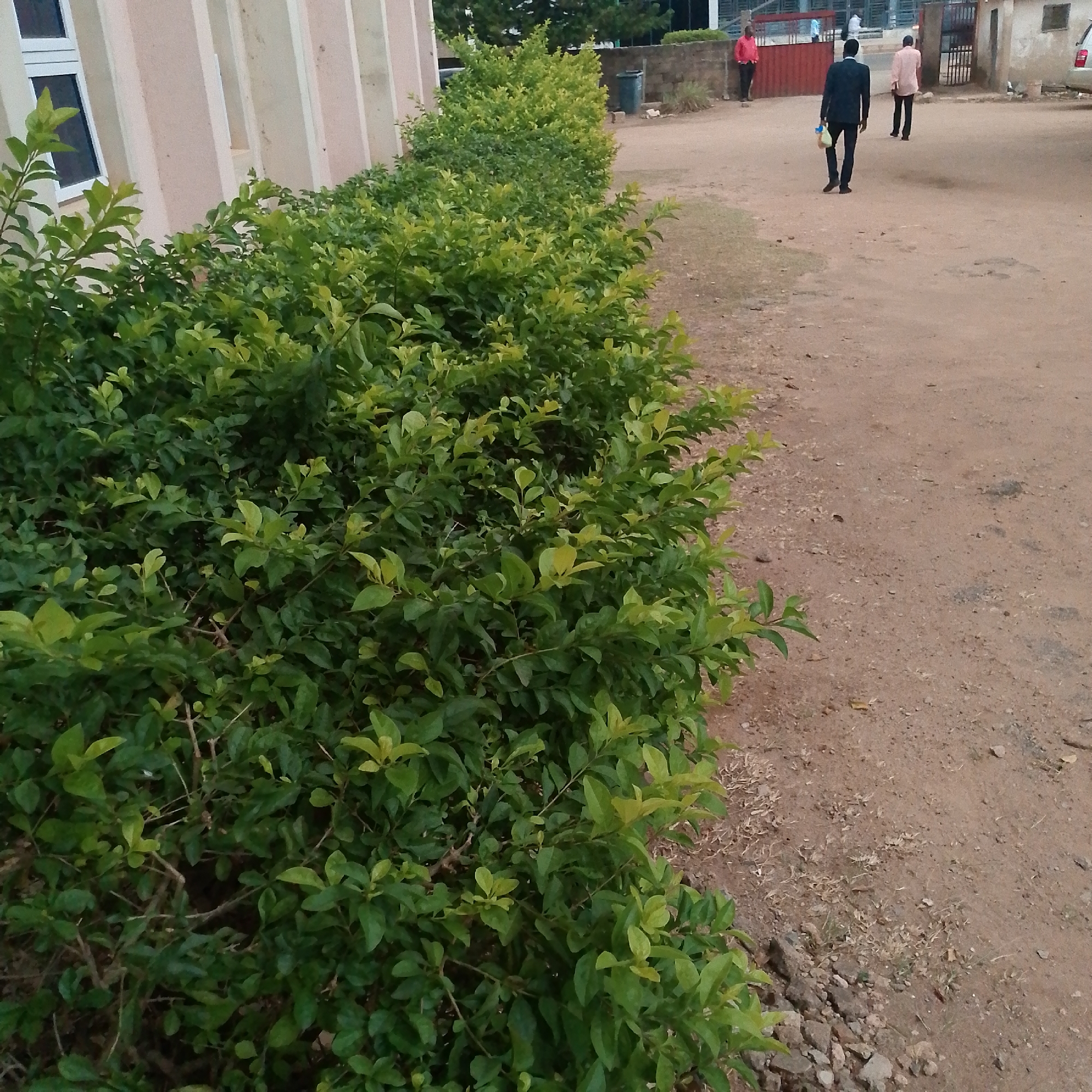 street scene in Unknown, Unknown. The foreground is dominated by a row of dense, green bushes lining the edge of a dirt path. Beyond the bushes, a building with vertical light-colored pillars and windows is visible. The dirt path leads to a more open area with a few individuals walking. One person, wearing a dark suit, is walking away from the camera while holding something in their hand. Two other people, dressed in lighter colored clothing, are walking in the same direction. In the background, there is a fence, a small building, and a vehicle. A trash can is also visible. The ground is mostly dirt with some patches of grass.
