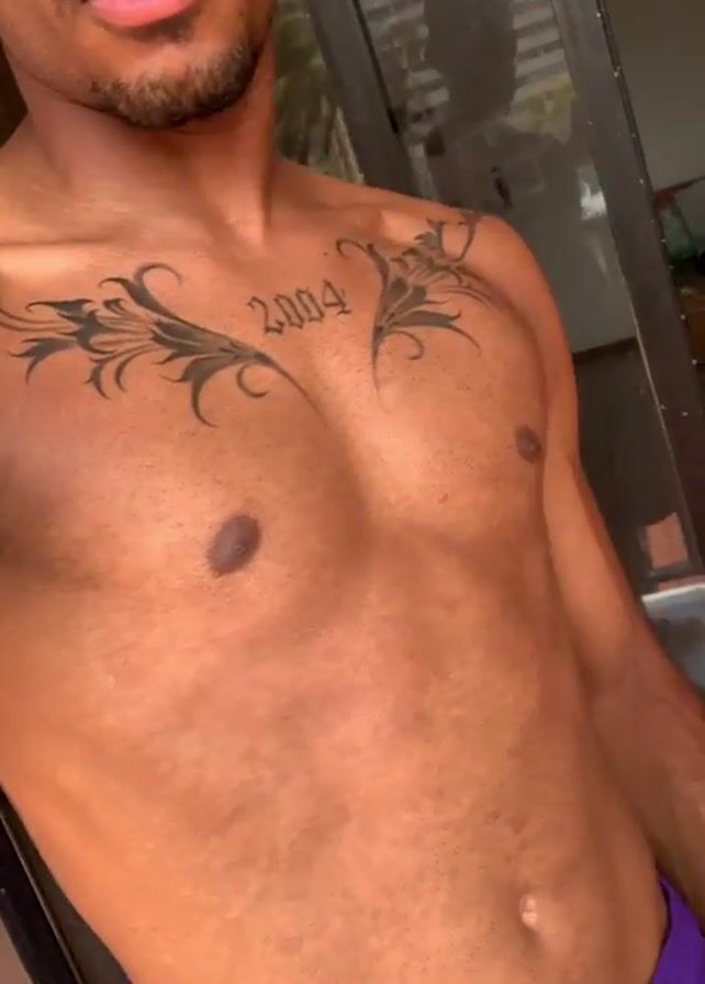 A man with dark brown skin and a trimmed beard is standing indoors wearing purple athletic shorts. The man is shirtless and visible from the mid-thigh up, facing the camera. A tattoo with the number "2004" and stylized swirls is visible on his upper chest. Behind the man is a sliding glass door leading to an indoor room. The door reflects the man and part of the room, including a soccer ball and wicker chair. The camera remains stationary.