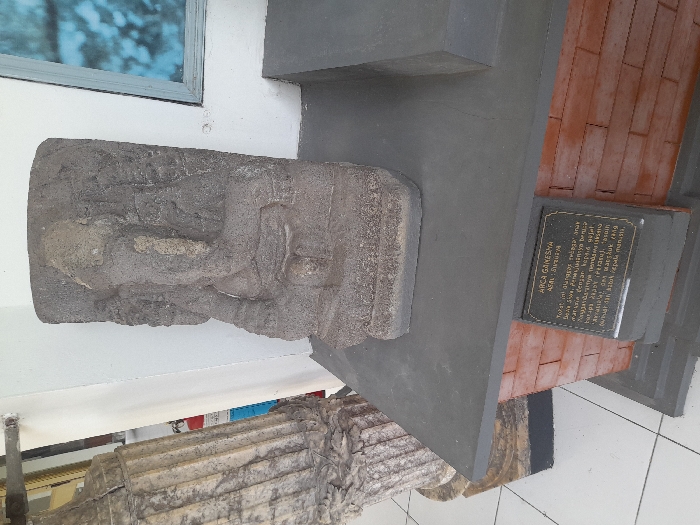 stone statue of Ganesha, the Hindu deity of wisdom and knowledge, sitting on a gray stone pedestal. The pedestal is on top of a brick platform. The statue has a square face with a large, rounded trunk, with the deity's hands folded in front of its chest. The statue is located in a building with a white wall, partially covered in a brown brick platform. The platform also has a black plaque with gold writing. The plaque reads "Arca Ganesya Asal: Diyusa". Behind the statue, a white wall with a window featuring a blurry blue view is visible. The scene is captured from a slightly angled perspective, showing the statue from the front. The location, as provided, is in Kecamatan Buduran, Indonesia, with coordinates -7.434 latitude and 112.72 longitude.