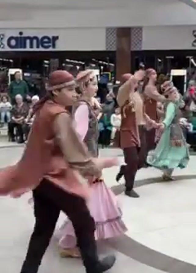 A group of young people performs a folk dance in an indoor public space