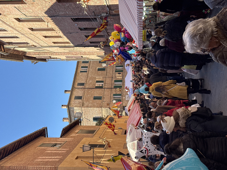 The image depicts a densely crowded street market within a narrow thoroughfare in Siena, Italy. Multi-story buildings, constructed of reddish-brown brick, line both sides of the street; several windows display dark green shutters. The scene is under a clear blue sky, with direct sunlight casting shadows. Numerous individuals, predominantly adults in winter clothing, occupy the street, navigating among market stalls. These stalls feature striped awnings, primarily red and white, extending along the thoroughfare. Specific objects include a large, inflatable white Dalmatian figure on the left, bearing the text 'Rinaldi Croccante Tenero'. Further into the scene on the right, a cluster of various character balloons, including Minions and pandas, is visible. The street is decorated with multiple red and yellow patterned flags, consistent with Sienese contrade, strung overhead and affixed to building facades. A person in a yellow coat is observed pushing a stroller amidst the crowd.