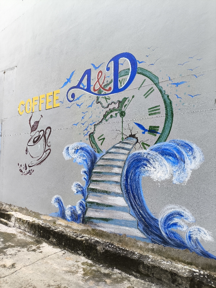 The image displays a vibrant mural painted on a light gray, possibly concrete, wall in an urban outdoor setting within South Quy Nhon Ward, Vietnam. The perspective is an upward angle from a concrete ground surface. The mural's design encompasses several distinct elements: 1. **Left Side:** The word "COFFEE" is rendered in yellow, capital letters. Below and to its right is a stylized depiction of a brown coffee cup with emanating steam and a leaf motif. 2. **Upper Center:** Large blue capital letters "A&D" with a red ampersand are prominently featured. Surrounding these letters and extending to the right are numerous small, blue bird silhouettes, many appearing to fly upwards. 3. **Right Side:** A large, partially fragmented and green-rimmed clock face with white inner sections is visible. Roman numerals (e.g., VI, IX, XII) are present, and the clock face shows cracks radiating from its center. A single blue bird silhouette flies directly towards the center of the fractured clock. 4. **Lower Center:** A series of gray and white steps ascends from the left towards the fractured clock face. These steps are surrounded by and appear to emerge from dynamic blue ocean waves with white caps, suggesting movement. The wall itself is a uniform light gray, exhibiting subtle horizontal lines or seams. The concrete ground immediately in front of the mural is discolored, with dark, possibly damp or mossy, areas along its edge where it meets the wall. The ground also shows minor cracks. There are no individuals, active interactions, or movable objects present in the scene.