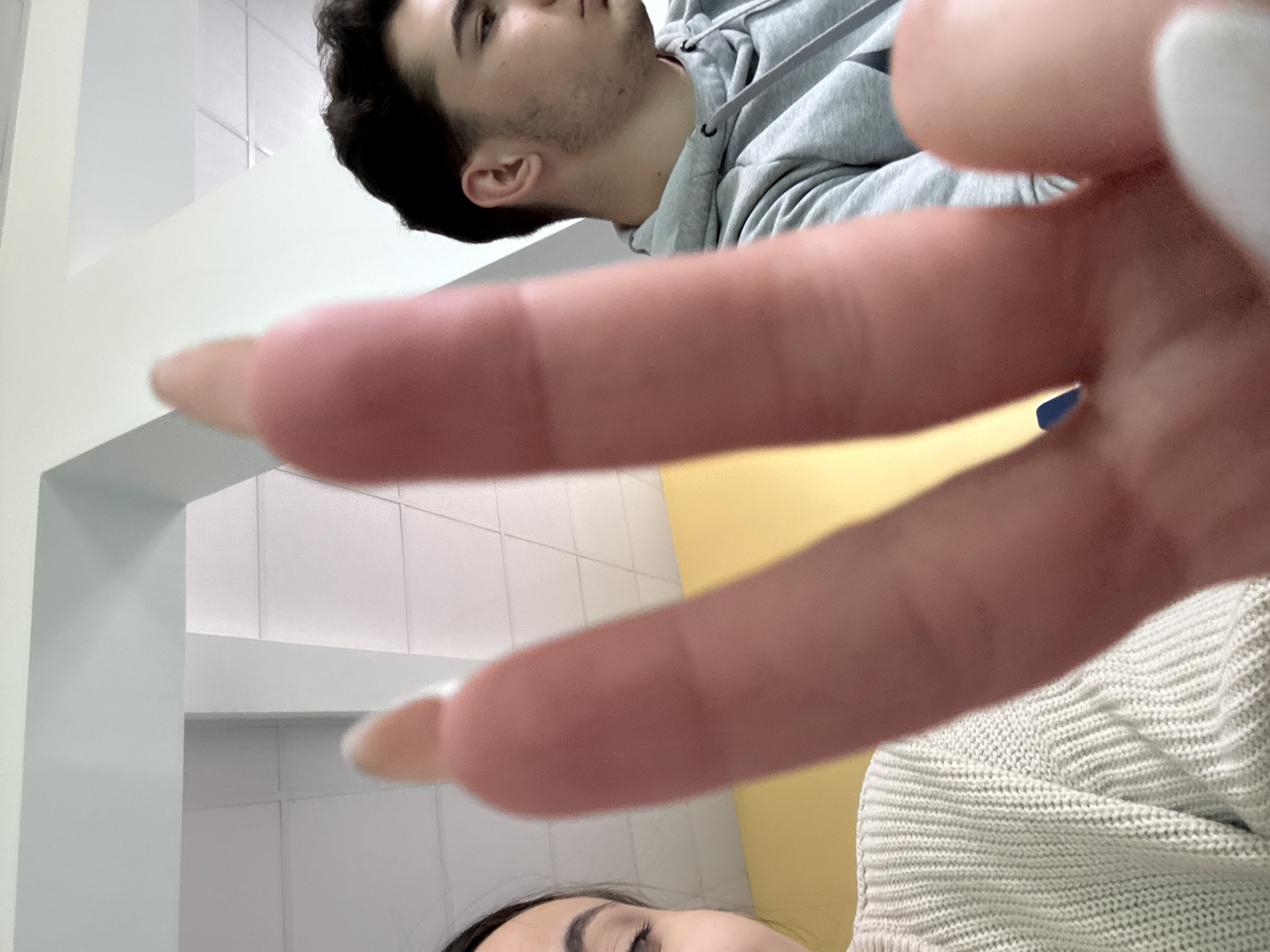 two people, a male and a female, in an indoor environment. The male is wearing a grey hoodie and has short dark hair. The female is wearing a white sweater. A hand with long fingernails is prominently featured in the foreground, partially obscuring the view. The background appears to be a tiled wall with a yellow section. The specific location in the city of Pernik, Bulgaria is not identifiable from the visual information.
