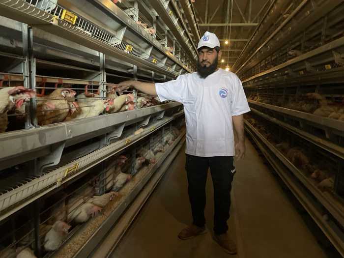 The image depicts the interior of a commercial poultry farm in Shuyene Vosta, Afghanistan