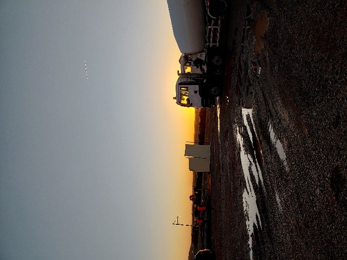A cement truck is parked on the side of a rocky road with puddles and a gray sky. The setting sun casts an orange glow on the horizon, illuminating the truck's cabin. Several people wearing orange vests stand near the road. There is a small building near the truck and a pole in the distance.