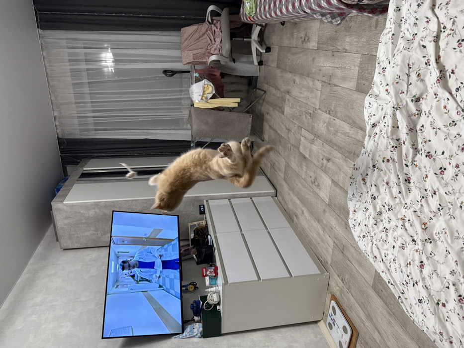 An indoor scene in a residential room in Chaikovsky, Russia, depicts an active domestic cat mid-jump