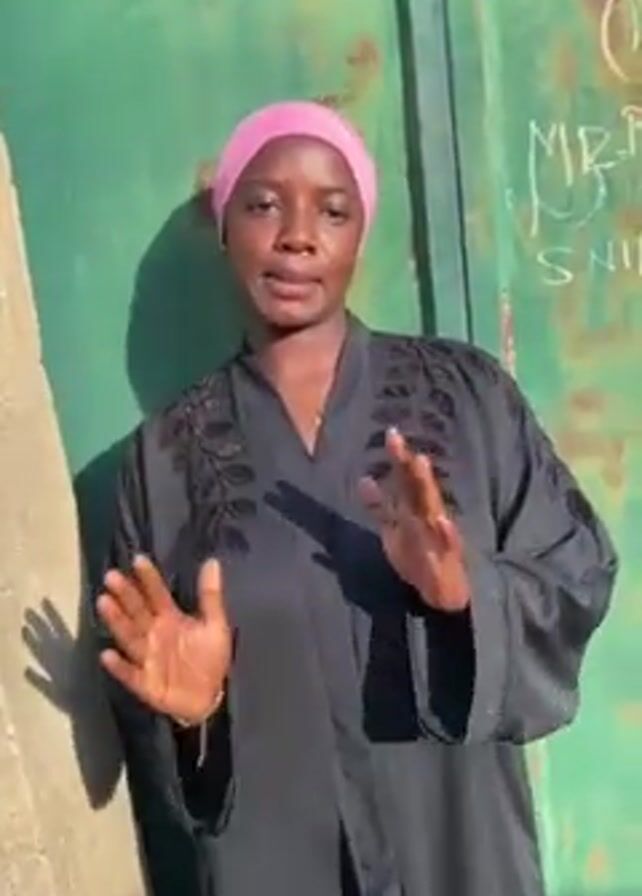 A woman stands in front of a green metal door, wearing a black robe with leaf-like embroidery on the shoulders and a pink headscarf. She demonstrates a hand gesture, moving her hands in a circular motion and then pointing to her chest. The door behind her has some graffiti on it. She appears to be outside during the daytime.