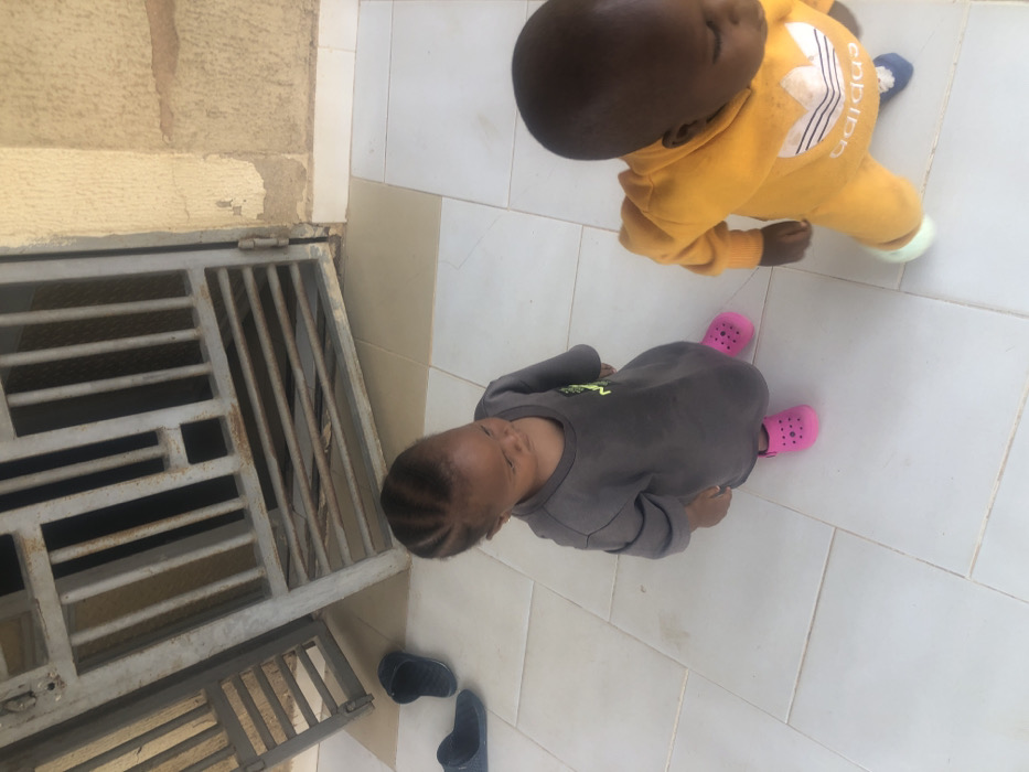 Two toddlers are observed standing on a tiled patio in what appears to be a residential or semi-private outdoor area within Barakin Akawo, Nigeria
