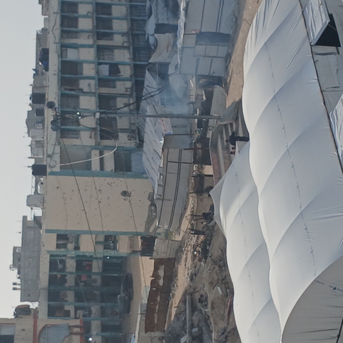 The image depicts an outdoor urban landscape in the city of Gaza, Palestinian Territory. In the foreground, several large, white, arched fabric structures, consistent with temporary shelters or facilities, are partially visible, occupying the lower half of the frame. The midground features an unpaved, sandy, and debris-strewn ground. Clustered throughout this area are numerous smaller, makeshift shelters constructed from tarpaulins, corrugated metal, and various salvaged materials. A utility pole with multiple dark cables runs vertically near the center. A faint plume of white smoke rises from a structure among the makeshift shelters. Several individuals are present; one person in dark clothing is observed walking on a concrete pathway with steps, while other less distinct figures are visible near the shelters. In the background, multiple multi-story buildings with light-colored facades are visible. These structures exhibit signs of wear and damage, including visible impact marks or holes on their exterior walls and numerous open or damaged window frames. Rooftops display water tanks and other small structures. The sky above is a uniform light gray.
