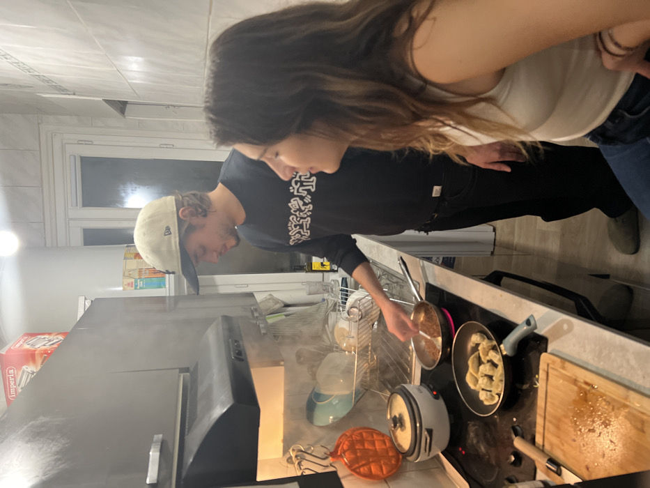 In a kitchen, two people cook. A man wearing a baseball cap and a black sweatshirt stirs food in a pan on a stove. Next to him stands a woman with long brown hair. Steam rises from the stove. On the stovetop, there are two pans, a small appliance, and a cutting board. The kitchen features white tiled walls and an overhead range hood. A box of food can be seen in the background.