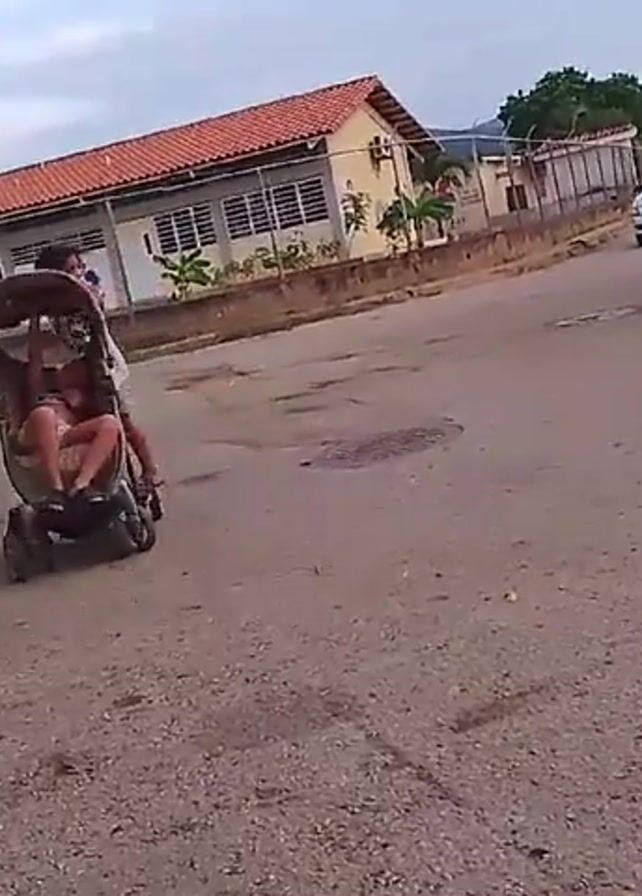 A young girl wearing a white dress with a green pattern and red sandals pushes a stroller with another child lying inside. The child in the stroller is wearing shorts and a patterned shirt. They are on a cracked paved road. Behind them is a one-story building with a red tile roof and barred windows. A white car is parked on the street. A motorcycle is parked nearby. The sky is overcast. There are trees and mountains in the background. The camera is moving as it records.