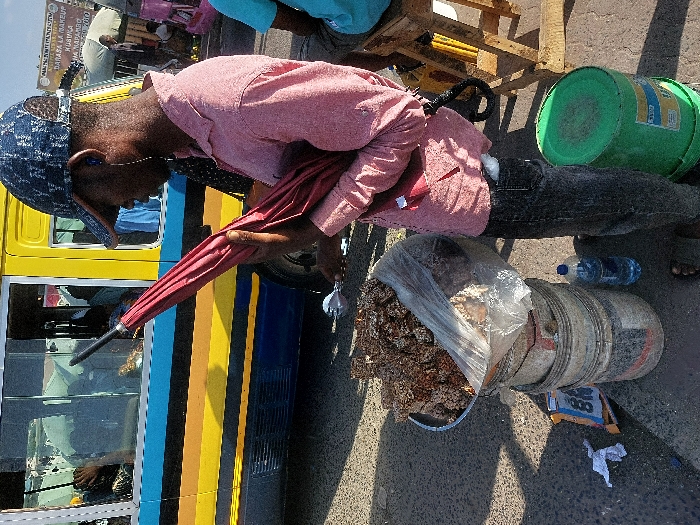 The image displays an urban street scene in Dar es Salaam, Tanzania, under daylight conditions. In the foreground, a dark-skinned male, presumably a vendor, stands facing left. He wears a blue patterned baseball cap, a light pink long-sleeved shirt, and dark-colored jeans. A blue earbud is visible in his right ear. He holds a folded red umbrella in his left hand and a small metallic item in his right hand. A white object is partially visible in his right rear pocket. To the vendor's left, a makeshift stall is present. It consists of a metal basin containing numerous dark, irregularly shaped food items, possibly snacks, partially covered by a clear plastic bag. This basin is supported by a stack of three dirty, light-colored buckets. On the ground adjacent to the buckets, a blue plastic water bottle and some discarded wrappers are visible. In the mid-ground, to the left of the vendor, a yellow and blue striped public transport minibus, characteristic of a Dar es Salaam 'Daladala,' is visible, with passengers observable through its windows. Further right, behind the vendor, a green lidded plastic bucket rests on the ground next to a wooden stool. A partially obscured white sign with dark text, including "DARASA LA MAKEUP" (Swahili for "Makeup Class"), is visible in the upper background, confirming the Tanzanian context. The ground surface is paved asphalt.