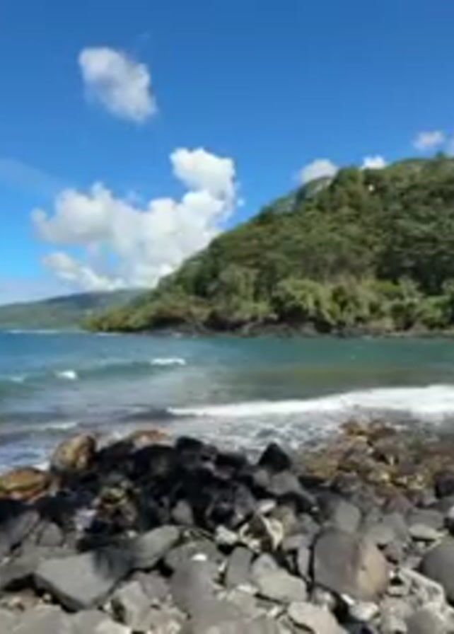 The video depicts a rocky shoreline under a bright blue sky with scattered white clouds. The waves are gently breaking on the shore, and the ocean extends to the horizon. Lush green vegetation covers a landmass in the background. The foreground is dominated by black volcanic rocks of varying sizes. A piece of driftwood lays on the rocks near the right side of the frame.