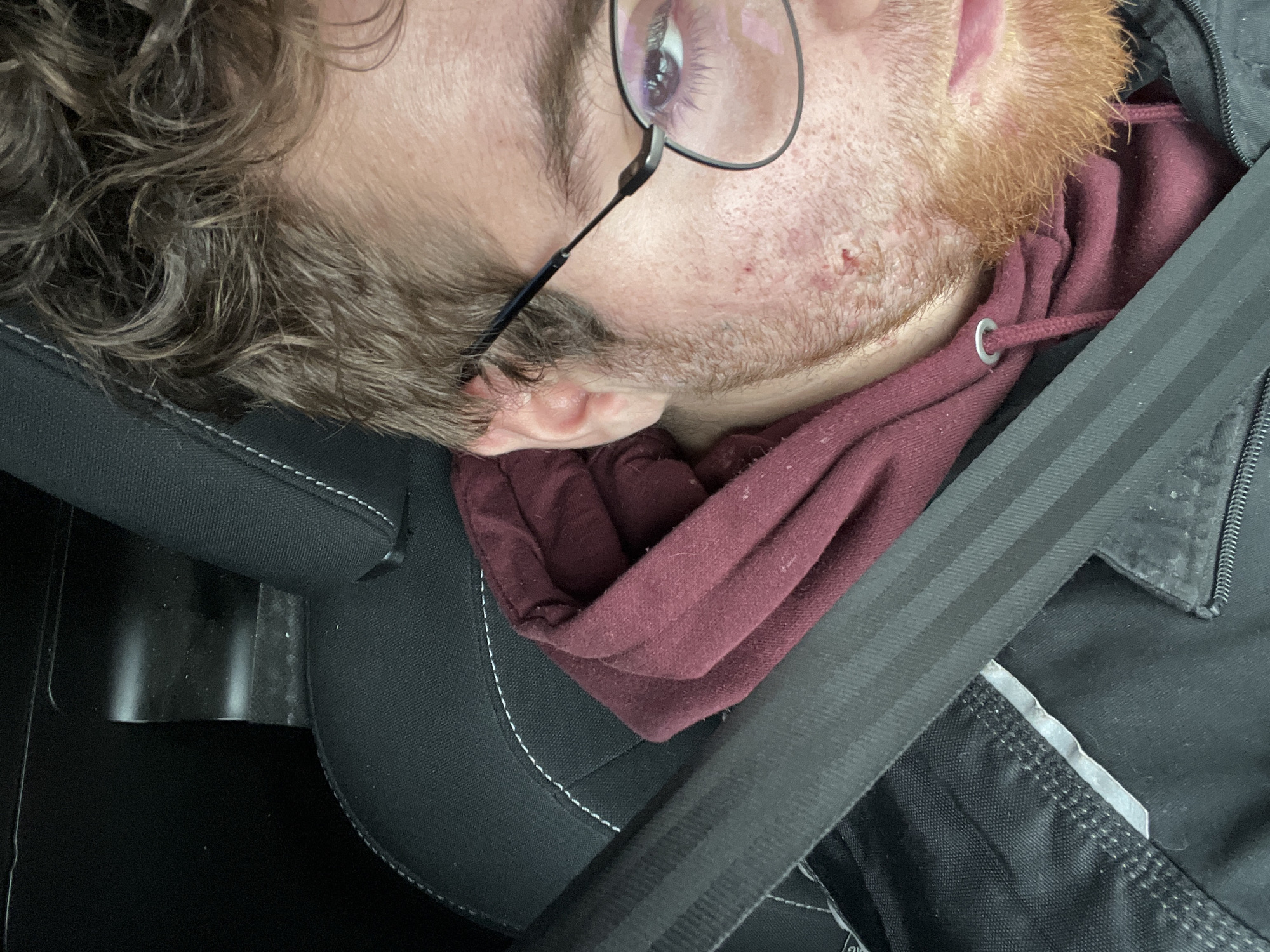 person, likely male, wearing glasses and a maroon hoodie, lying with their head resting against a car seat