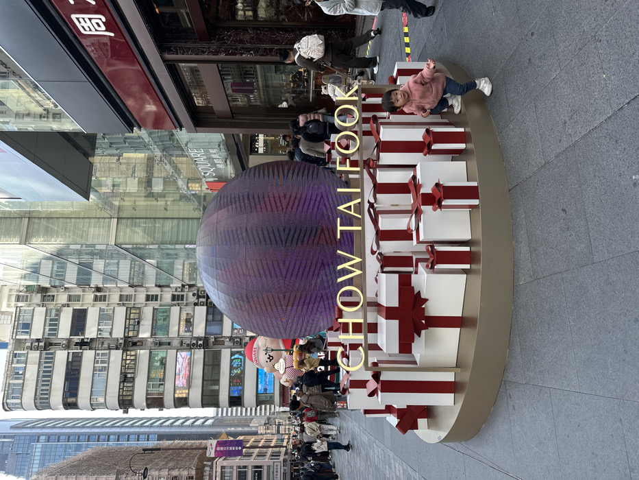 A young child in a pink sweater stands on a multi-tiered display of white gift boxes adorned with red ribbons, part of a Chow Tai Fook advertisement. Behind the display stands a large, geometrically patterned sphere. Pedestrians walk nearby. Tall buildings line the background, their architecture varied, including modern glass structures and older buildings with numerous windows. The scene unfolds on a grey paved area, likely a pedestrian zone.