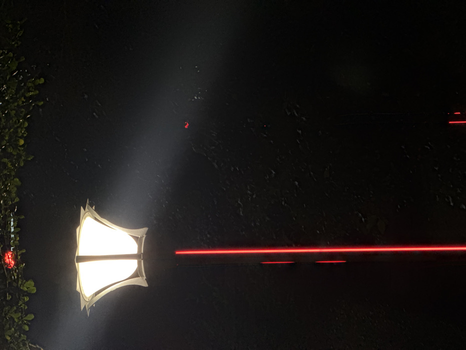 At night, a glowing, lantern-style streetlight illuminates the scene. The bright light shines against a dark, textured background that might be a wall or foliage. A long, horizontal red laser cuts across the image. Additional, smaller red laser marks appear farther away. The overall scene is dark and mysterious.