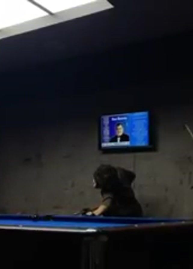 Two young men are playing pool in a dimly lit room with textured walls. The pool table is blue and has several balls on it. One man is bending over the table, aiming with his cue stick. The other man stands behind him, smiling and holding his own cue stick. Above them, a small television screen displays a news program. The room is illuminated by a rectangular light fixture in the ceiling.