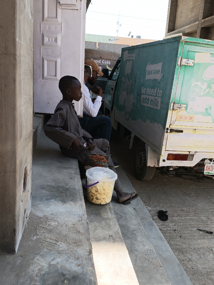 The image portrays an outdoor urban scene in Fagge C, Nigeria, illuminated by bright daylight. In the foreground, a young male, likely a pre-teen, with dark skin and short dark hair, is seated on a concrete step. He is wearing a dark grey long-sleeved tunic and dark flip-flops. A clear plastic bucket with a lid and purple handles rests beside his right leg, containing multiple light-yellow, rectangular food items. A multi-colored patterned fabric is visible on his lap. His attention is directed towards the right. To the right of the boy, an adult male is partially visible, seated within a vehicle. He wears a light-colored long-sleeved shirt, dark trousers, and a brown baseball cap, and possesses a beard. Behind the adult male, a light-colored utility truck with a prominent green cargo box is parked on a dirt or asphalt surface. The cargo box features white lettering, including "SAVE CASH!" and "No need to add milk," along with obscured graphic elements. A Nigerian license plate, partially legible as "AKD-...", is mounted on the rear of the truck. The immediate background on the left reveals a white, panelled door set into a concrete wall. Further in the background, commercial signage for "MALTINA" and "Good Cafe" is visible against a bright sky, indicating a commercial area. Debris, including a dark crumpled object and a slender dark object, is present on the ground near the truck's rear wheel.
