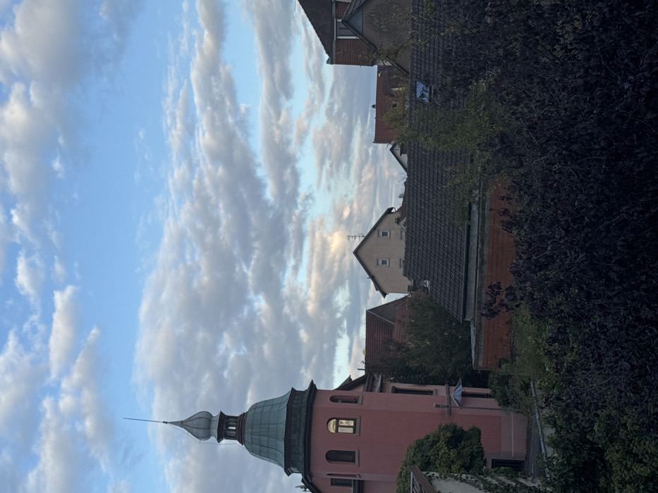 The image displays an urban landscape in Bischheim, France, under a sky with scattered altocumulus clouds