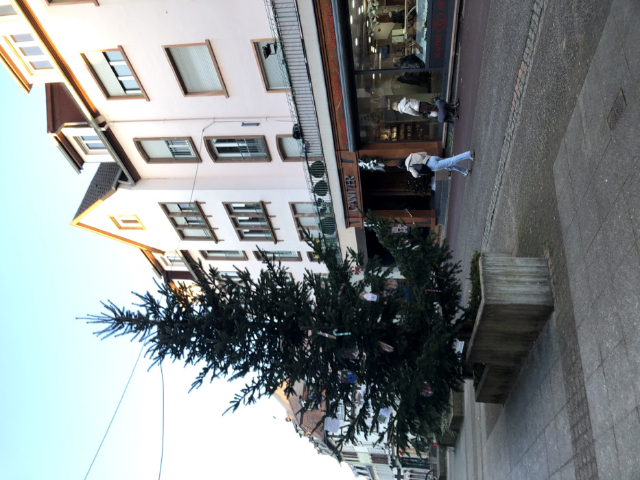 The image depicts a daytime street scene in Saverne, France, showing a commercial area with multi-story buildings, pedestrians, and a decorated Christmas tree