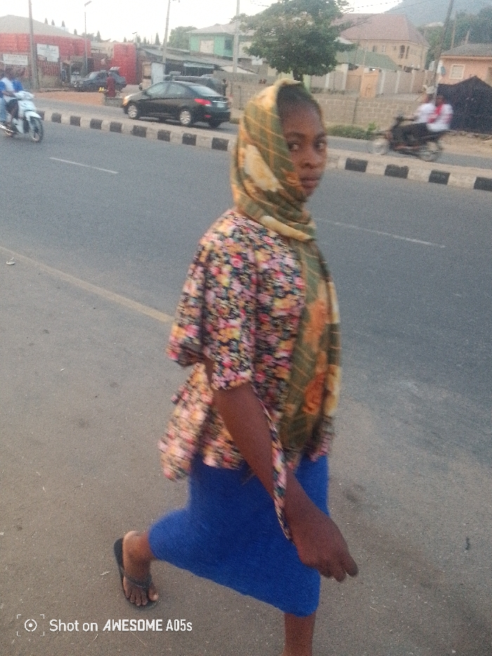 A young woman in a floral top, blue skirt, and headscarf walks along a road with a curb