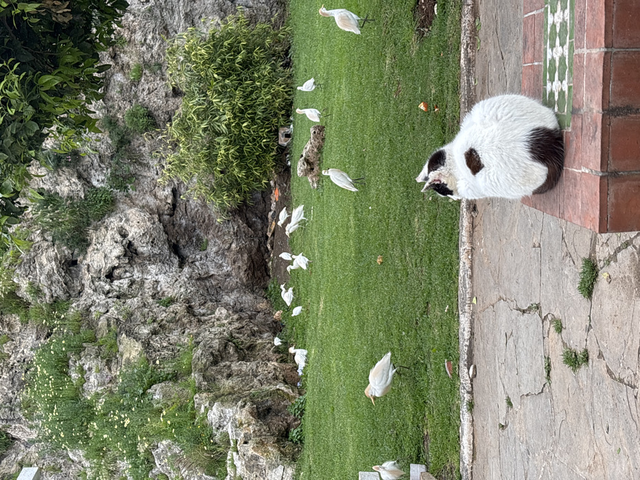 The image displays an outdoor scene within a public park in the city of Tétouan, Morocco. In the immediate foreground, a cracked concrete slab path with sparse weeds transitions into a low, red-brick structure topped with green and white patterned tiles. A domestic cat, predominantly white with black markings on its head and a distinct dark brown patch on its lower back, sits on this brick structure with its back to the viewer, facing towards the central area of the park. Beyond the brick structure is a manicured green lawn, where approximately two dozen white cattle egrets (Bubulcus ibis) are scattered, standing, and foraging. Some egrets exhibit buff-colored patches on their heads and chests, consistent with breeding plumage. In the mid-ground, to the right, a dense, light green leafy bush is present. The background is dominated by a large, gray rocky cliff face, featuring crevices and sparsely covered with green vegetation and small white flowers. Additional green foliage from a tree is visible in the upper right corner. Small pieces of debris, possibly food remnants, are scattered on the grass.