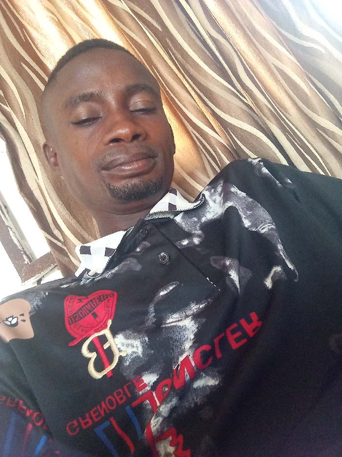 A close-up portrait, likely a selfie, features an adult male of African descent with short, dark hair and a goatee