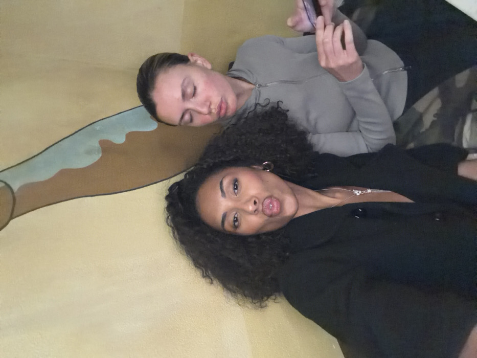 Two adult females are captured in a close-up indoor photograph. The subject on the left, with dark, voluminous curly hair, faces the camera with lips pursed, wearing a black collared garment, a silver necklace with a pendant, and hoop earrings. The subject on the right, with light hair pulled back, is oriented slightly away from the camera, also displaying pursed lips and partially closed eyes, while wearing a light grey zippered hoodie and holding a dark-colored smartphone in her left hand. The background consists of a textured, light yellow wall featuring a large, abstract mural depicting an elongated, brown organic shape with lighter blue accents. The precise indoor location within Paris, France, cannot be determined from the visual information presented.