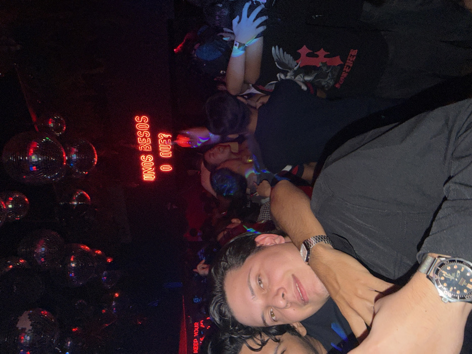 A dimly lit scene shows a group of people, possibly at a nightclub, with disco balls hanging from the ceiling. A red neon sign reads "Unos besos o que?" A man wearing a watch on his left wrist smiles towards the camera from the bottom of the shot. Another man's face is partially visible next to him. A person in white gloves can be seen among a crowd in the background.