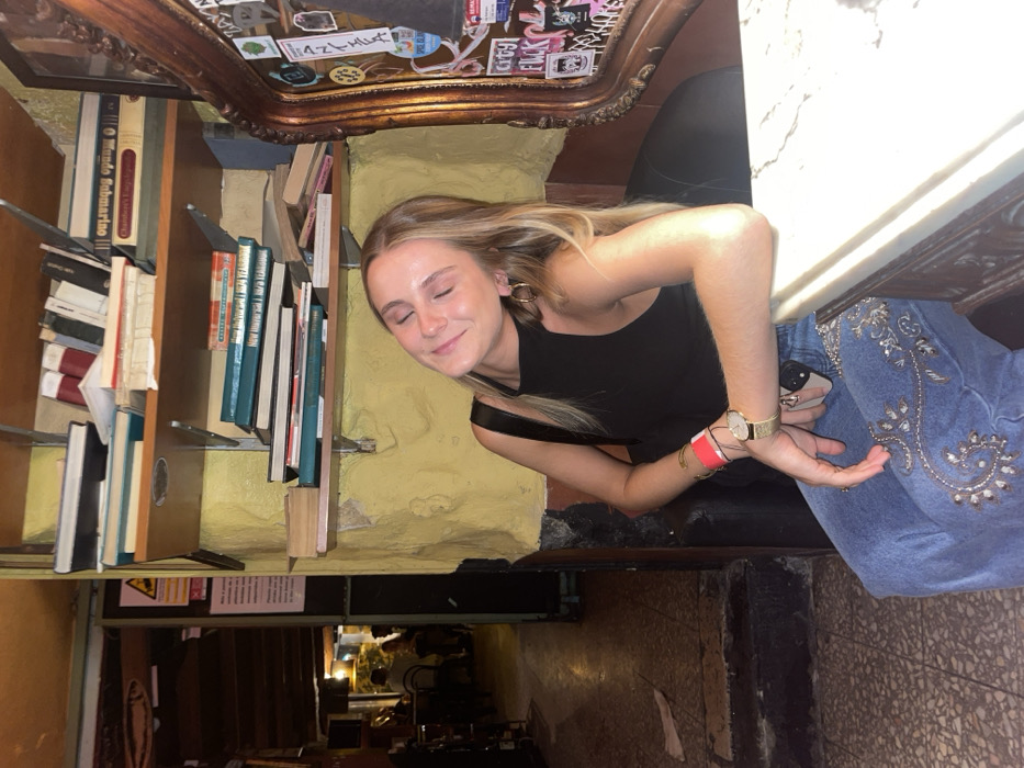 A young Caucasian woman is seated at a table inside a rustic commercial establishment in Lisbon, Portugal