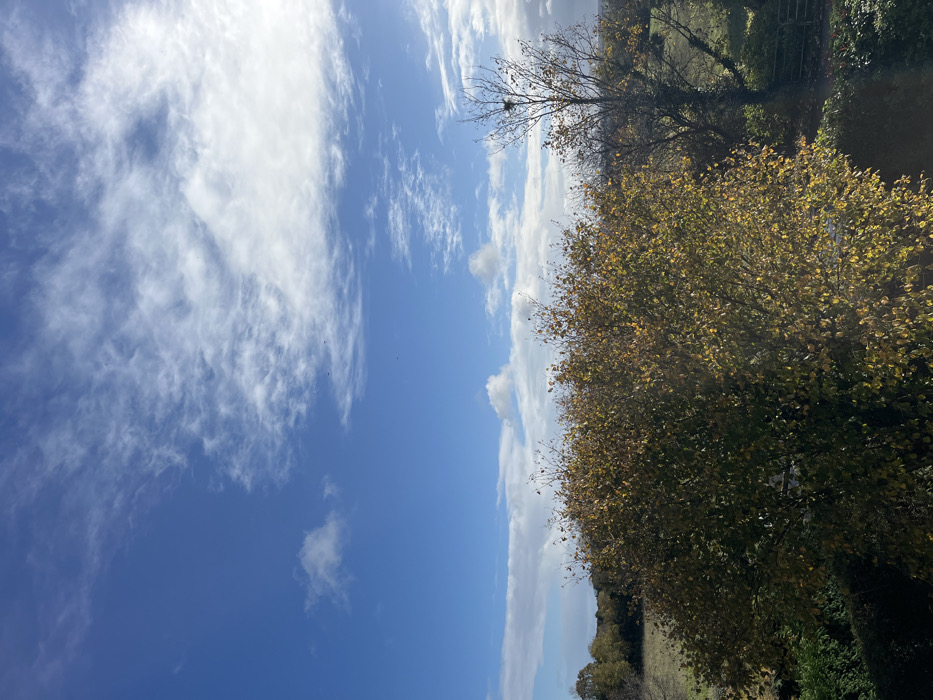 This image depicts a rural or semi-rural landscape located in Vieux, France, under a clear blue sky with scattered white clouds. The sun is positioned to the upper right, casting bright illumination across the scene. In the foreground and mid-ground, a large, deciduous bush or tree with dense, yellow-green autumn foliage dominates the lower-center and left. To its right, a taller, mostly bare deciduous tree stands, clearly showing a bird's nest constructed within its upper branches. Further right and slightly lower, dark green foliage possibly indicates another bush or hedge, and a dark fence or gate structure is partially visible through sparse branches. The background reveals a light brown or tan field, indicative of dry grass or harvested land, extending towards a distant dark treeline that defines the horizon. The sky features a mix of wispy cirrus-like clouds stretching from the upper right across the frame, and more defined cumulus clouds appearing towards the left and lower sky. Several small, dark avian forms are visible against the blue sky, suggesting birds in flight. No human figures or specific actions are depicted.